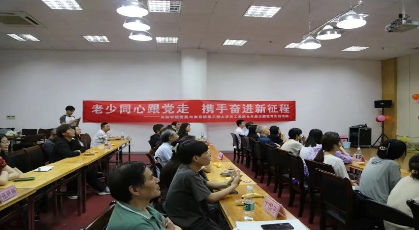 5月31日下午,南京信息工程大学关工委、法政学院关工委在体育馆一楼新闻中心联合开展“老少同心跟党走 携手奋进新征程”主题教育实践活动。校关工委秘书长、离退休党支部书记范天森,校关工委副秘书长、离退休党工委副书记、离退办副主任刘洪清,法政学院关工委常务副主任赵海燕,离退休党支部书记卞国平老师,离退休教师代表万长建、何明、王连喜、王建豪、宗长才、钮敏等,法政学院党委副书记张昳丽、学办主任王娟以及法政学院师生代表等参加活动。